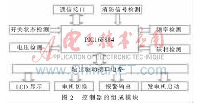 智能型雙電源開關(guān)控制器以單片機(jī)PIC16F884為核心,對兩路供電電源(常用電源和備用電源)的電壓、頻率和相位進(jìn)行實(shí)時(shí)檢測。當(dāng)其中一路電源(常用電源或備用電源)的電壓發(fā)生過壓、欠壓或是缺相時(shí),控制器就會(huì)發(fā)出電機(jī)切換命令,使供電電源自動(dòng)切換到另一路電源(備用電源或常用電源)上,以此來保障供電的連續(xù)性??刂破鞯墓ぷ鞣绞街饕凶詣?dòng)方式和手動(dòng)方式兩種??刂破鞯慕Y(jié)構(gòu)框圖如圖1所示,組成模塊如圖2所示。