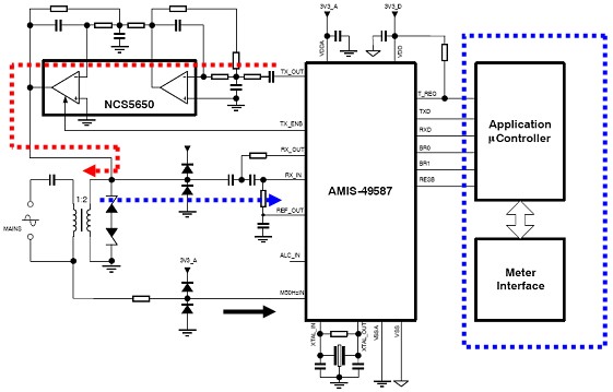 藍(lán)色箭頭表示接收路徑。變壓器從電力線耦合過來的信號經(jīng)AMIS-49587內(nèi)置放大器構(gòu)成的低通濾波器由內(nèi)部ARM進(jìn)行FSK解調(diào)分析。圖中黑色箭頭是50Hz的過零檢測信號引腳。系統(tǒng)依靠這個信號進(jìn)行同步定時。圖中藍(lán)色虛線內(nèi)是電表內(nèi)的應(yīng)用處理器,負(fù)責(zé)應(yīng)用層處理通信及計量。