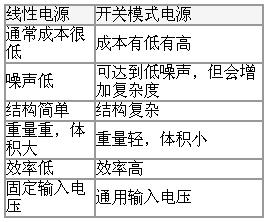 與傳統(tǒng)的線性電源相比,開關(guān)電源具有許多優(yōu)點(diǎn)。在通常情況下,如果只需要一個直流輸出,采用一個變壓器、整流器和濾波電容就可構(gòu)成線性電源。有時(shí),可采用一個線性穩(wěn)壓器提供穩(wěn)壓輸出。這種系統(tǒng)的主要優(yōu)點(diǎn)是簡單,所以成本通常較低。而開關(guān)電源通常結(jié)構(gòu)復(fù)雜、價(jià)格昂貴,所以線性電源獲得了廣泛應(yīng)用。表1列出了兩種系統(tǒng)的優(yōu)點(diǎn)和缺點(diǎn)。
