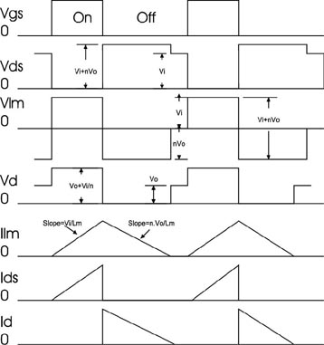 盡管可采用電感器,但所示設(shè)計(jì)采用的是未隔離的變壓器。隔離設(shè)計(jì)在離線設(shè)備中更為常見,在離線設(shè)備中,變壓器具有隔離作用,可方便地實(shí)現(xiàn)占空比調(diào)整。反激式開關(guān)電源可在非連續(xù)導(dǎo)通和連續(xù)導(dǎo)通兩種模式下工作,不連續(xù)導(dǎo)通模式如圖2所示。Ilm和Vlm是變壓器磁化電感通過的電流和施加的電壓。