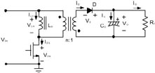 [page]當(dāng)開關(guān)閉合時(shí),電壓施加在變壓器初級的兩端,因?yàn)榇藭r(shí)次級二極管是截止的,變壓器所起的作用就像電感器。經(jīng)過初級線圈的電流會上升,同時(shí)能量儲存在磁通量中。當(dāng)開關(guān)斷開時(shí),次級二極管導(dǎo)通,電流通過次級時(shí)會下降,因?yàn)槟芰勘晦D(zhuǎn)換至次邊大容量電容器。如果電流經(jīng)過磁化電感區(qū)后降至零,這是不連續(xù)導(dǎo)通模式。如果磁化電流未降至零,如圖3所示,則系統(tǒng)以連續(xù)導(dǎo)通模式工作。