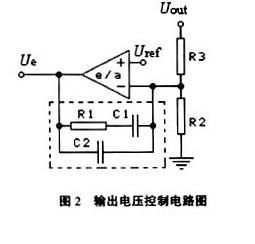 輸出電壓Uout在作為控制取樣信號(hào)時(shí),通常經(jīng)過圖2所示的電路進(jìn)行處理,得到電壓信號(hào)Ue,Ue再經(jīng)處理或直接送入PWM控制器。圖2中電壓運(yùn)算放大器(e/a)的作用有三:
