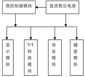 本設(shè)計(jì)采用單片機(jī)作為主要控制部件,通過鍵盤預(yù)置輸出電流值并采用液晶模塊實(shí)時(shí)顯示。整個(gè)系統(tǒng)硬件部分由微控制器模塊、電壓-電流轉(zhuǎn)換模塊、鍵盤模塊、顯示模塊、直流穩(wěn)壓電源模塊和語音提示模塊組成。系統(tǒng)結(jié)構(gòu)框圖如圖1所示。