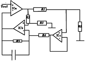 電壓-電流轉(zhuǎn)換模塊的組成還有另外一種方案,采用3個(gè)運(yùn)放構(gòu)成輸出電流可變的電流源,如圖3所示。輸出電流I=Vi/R1,為使R1兩端的電壓保持恒定,由差分放大器IC1b通過射隨器IC1c監(jiān)測R1兩端的電位,此電位經(jīng)IC1b的7腳加到比較器ICa的反相輸入端與Vref比較。比較結(jié)果使比較器的輸出端變化,直到平衡為止,即Vr1=Vi。電路中的電容用于補(bǔ)償ICa的頻率,減少控制環(huán)路的延時(shí)。只要R1=R2=R3=R4=R5,此電路的性能較好。但此電路的帶負(fù)載能力不強(qiáng),環(huán)路延時(shí)補(bǔ)償對電路的穩(wěn)定有較大影響。