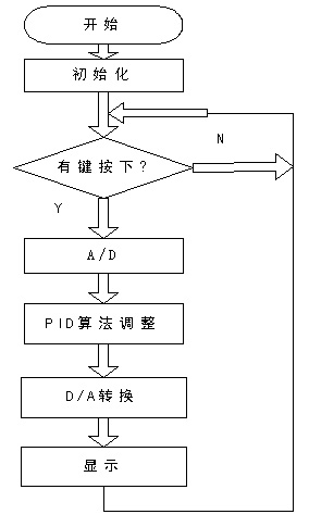 在工作過程中,SPCE061A單片機(jī)將被預(yù)置的電流值通過換算進(jìn)行D/A轉(zhuǎn)換,以輸出電壓驅(qū)動(dòng)V/I轉(zhuǎn)換電路實(shí)現(xiàn)電路輸出,并將該電流值對應(yīng)的電壓值通過閉環(huán)回路,經(jīng)A/D轉(zhuǎn)換后輸入單片機(jī)系統(tǒng),再通過PID算法調(diào)整電流輸出。整個(gè)系統(tǒng)工作流程圖如圖4所示。
