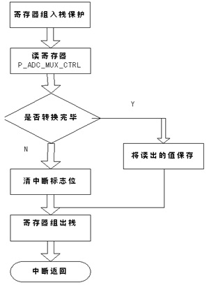 A/D轉(zhuǎn)換部分程序主要用于將采樣電阻采到的模擬電壓信號轉(zhuǎn)換為數(shù)字信號。采樣信號由IoA6輸入并直接送入緩沖器P_ADC_MUX_Data,在ADC自動(dòng)方式被啟用后,會產(chǎn)生一個(gè)啟動(dòng)信號,此時(shí),RDY=0,DAC0的電壓模擬量與外部的采樣模擬比較,以盡快找出外部信號模擬量的數(shù)字量,A/D轉(zhuǎn)換的結(jié)果保存在SAR內(nèi)。當(dāng)10位A/D轉(zhuǎn)換完成時(shí),RDY=1,此時(shí),通過讀P_ADC_MUX_Data單元可以獲得10位A/D轉(zhuǎn)換的數(shù)據(jù)。其IRQ1中斷服務(wù)程序的流程圖如圖6所示。