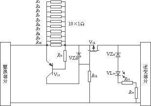 在圖8中,R1—R10為1Ω的標準電阻,功率為2W,當電流超過預定值時,在并聯(lián)電阻上的壓降超過0.7V,三極管導通,此時,MOSFET將因柵源極間承受反向電壓而截止,從而切斷主電路;當電流值正常時,MOSFET正常導通,不會影響電路的正常工作。這種電路的缺點在于,如果電路中出現(xiàn)時斷時續(xù)的過電流時,MOSFET將會不斷地動作。為此,在圖3中還加入了其他保護元器件。