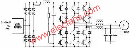 如圖1所示,圖中系統(tǒng)由電網(wǎng)高壓直接經(jīng)高壓斷路器進(jìn)入變頻器,經(jīng)過高壓二極管全橋整流、直流平波電抗器和電容濾波,再通過逆變器進(jìn)行逆變,加上正弦波濾波器,簡(jiǎn)單易行地實(shí)現(xiàn)高壓變頻輸出,直接供給高壓電動(dòng)機(jī)。