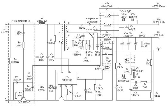 該電源以5V輸出作為主輸出,其他兩路輸出都是在此基礎(chǔ)上獲得的。由C11,R11,R12和MOS場效應(yīng)管V2及V1構(gòu)成5V主輸出的電容耦合式同步整流器。穩(wěn)壓管VDZ3起箝位作用。在沒有開關(guān)信號時,通過下拉電阻R13使V2關(guān)斷。儲能電感L2回掃繞組的電壓經(jīng)過VD4和C9整流濾波后,獲得20V輸出。高頻變壓器次級繞組(8-5)的電壓經(jīng)過VD3和C10整流濾波后獲得7.5V輸出。將6.8V穩(wěn)壓管VDZ4和二極管VD7反極性串聯(lián)后作為7.5V輸出的負載電阻,以改善空載穩(wěn)壓特性??蛰d時輸出電壓一旦超過7.5V,VDZ4就被反向擊穿,利用VDZ4和VD2上的壓降可將輸出電壓箝制在大約7.5V上。正常工作時,輔助繞組的輸出電壓經(jīng)過VD6、C5整流濾波后給光耦合器PC357提供12~15V的偏壓。R5、VD8和C16組成軟啟動電路,能防止在啟動過程中輸出過沖。