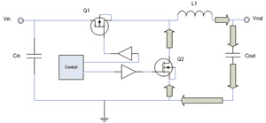當Q1關(guān)斷、Q2導(dǎo)通時,就形成了第二個回路。之后存儲在L1內(nèi)的能量流經(jīng)輸出電容器和Q2,如圖5所示。這些回路面積控制對于降低電磁干擾是很重要的,在PCB走線布線時就要預(yù)先考慮清器件的布局問題。當然,回路面積能做到多小也是有實際限制的。