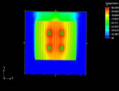盡管散熱器的參數(shù)優(yōu)化對(duì)溫升控制略有改善,但仍不能滿足功率管的可靠性要求,因此,我們考慮強(qiáng)迫風(fēng)冷的散熱方式。在上述計(jì)算模型的基礎(chǔ)上,我們?cè)诖怪狈较蛟O(shè)定流體的流速為1.5m/s , 即在散熱器底部送風(fēng),其他參數(shù)不變。我們注意到,此時(shí)系統(tǒng)給出的流態(tài)為紊流。在初始條件中作相應(yīng)的調(diào)整后,最終求得的器件表面最高溫度約為89°C。散熱器底板截面溫度圖及橫向風(fēng)速云圖分別見圖2、3。