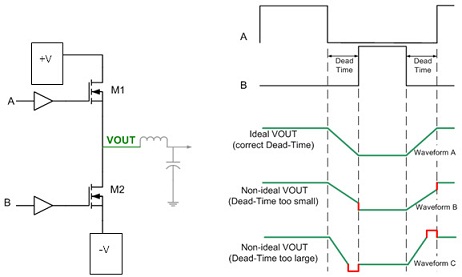 D類放大器死區(qū)時(shí)間(即兩個(gè)開(kāi)關(guān)均處于關(guān)閉狀態(tài)時(shí)的時(shí)間段)直接影響到效率和THD。過(guò)于短暫的死區(qū)時(shí)間會(huì)引起直通電流,降低效率,過(guò)長(zhǎng)的死區(qū)時(shí)間又會(huì)增大THD,這會(huì)給音頻保真度帶來(lái)不利影響。