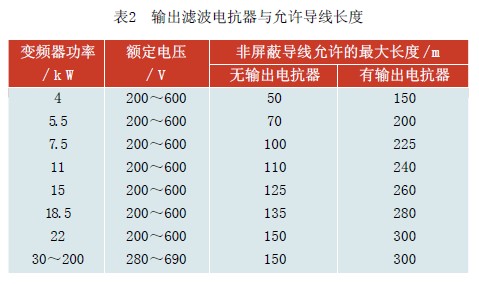 在變頻器的輸出側(cè)是否要配置電抗器,可根據(jù)工程實際情況而定。表2 是輸出濾波電抗器與允許導(dǎo)線長度。