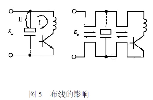 流過(guò)開(kāi)關(guān)大電流的導(dǎo)線(xiàn)應(yīng)盡量短,并且不跟其它線(xiàn)交連。降壓型開(kāi)關(guān)穩(wěn)壓電源的續(xù)流二極管或者升壓型的開(kāi)關(guān)三極管的接地端應(yīng)以最短的引線(xiàn)直接與輸出電容的地端相連。圖5表示了布線(xiàn)的影響,尖峰干擾通過(guò)環(huán)路I輻射,故構(gòu)成這一環(huán)路的各段連線(xiàn)的感性耦合必須最小,電容器的引線(xiàn)要短,以減小引線(xiàn)電感。