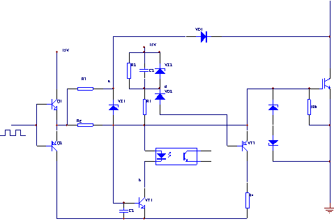 正常工作時,因故障檢測二極管VD1的導(dǎo)通,將a點的電壓鉗位在穩(wěn)壓二極管VZ1的擊穿電壓以下,晶體管VT1始終保持截止?fàn)顟B(tài)。當(dāng)電路發(fā)生過流或短路故障時,V1上的uce上升,a電壓隨之上升,到一定值時,VZ1擊穿,VT1通,b點電壓下降,電容C1通過電阻R1充電,電容電壓從零開始上升,當(dāng)電容電壓上升約1.4V時,晶體管VT2開通,柵極電壓uge隨電容電壓的上升而下降,通過調(diào)節(jié)C1的數(shù)值,可控制電容的充電速度,進(jìn)而控制uge的下降速度;當(dāng)電容電壓上升到穩(wěn)壓二極管VZ2的擊穿電壓時,VZ2擊穿,uge被鉗位在一固定的數(shù)值上,慢降柵壓過程結(jié)束,同時驅(qū)動電路通過光耦輸出過流信號傳送至單片機(jī),此時單片機(jī)發(fā)出聲光報警并開始運(yùn)行延時程序。如果在單片機(jī)的延時過程中,故障信號消失了,則a點電壓降低, VT1恢復(fù)載止,C1通過R2放電,d點電壓升高,VT2也恢復(fù)截止,uge上升,電路恢復(fù)正常工作狀態(tài),單片機(jī)自動進(jìn)行復(fù)位。如果單片機(jī)在延時結(jié)束后,故障信號仍存在則由單片機(jī)切斷所有IGBT的輸入脈沖,設(shè)備停止工作,此時要通過手動復(fù)位才能恢復(fù)正常工作。這種電路既能保護(hù)逆變電路和IGBT的安全,又不會在瞬時過流時中斷逆變電源工作所以是一種非常有效的保護(hù)方式。