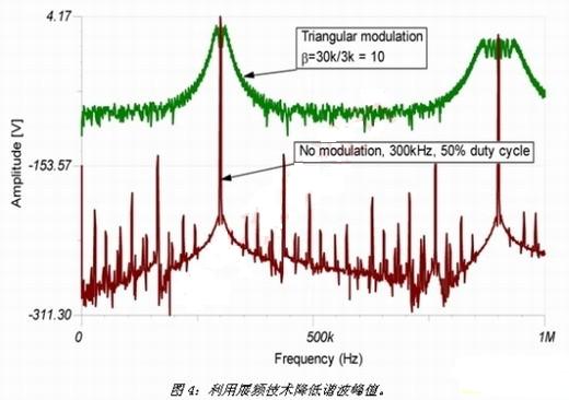 最后,本文將探討另一項越來越受到廣泛使用的技術(shù),能夠?qū)⒎逯抵C波能量散布于較大的頻帶,以有效降低該能量。該技術(shù)被稱為展頻頻率抖動(SSFD),能夠通過諧波峰值的降低將噪聲信號從窄頻變成寬頻,以改變噪聲頻譜。其中必須了解能量頻譜的變化,而整個能量則維持不變。最終的結(jié)果是噪聲水平一般會增加,從而損害高保真系統(tǒng)。圖4顯示發(fā)生的諧波擴散及峰值降低。一般降低的幅度為5至10dB,后續(xù)的諧波會增加峰值降低的幅度。