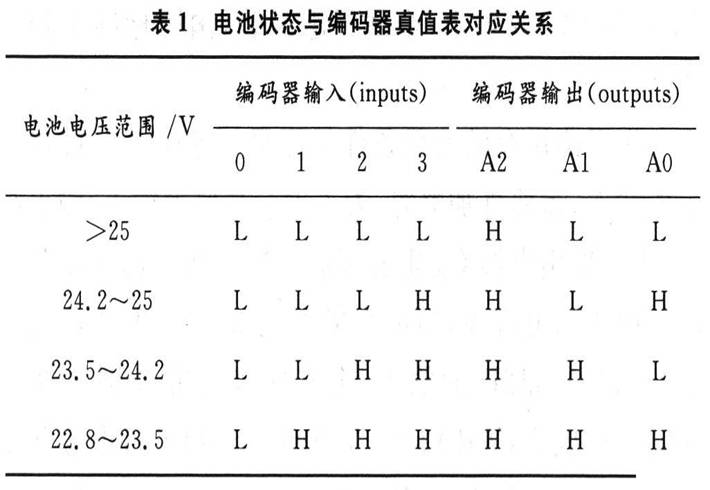 編碼器74HCl48低電平有效,所以在比較器LMl39的后面又接了反相器74HC04,編碼器輸入/輸出的二進制碼(真值表)與電池電壓的關(guān)系如表1所示。