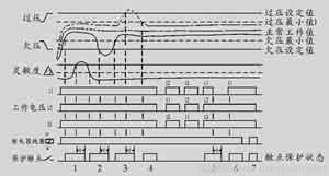 如工作電壓超出其欠壓設(shè)定值時(shí),吸合工作觸點(diǎn)進(jìn)入所設(shè)定的延時(shí)保護(hù)狀態(tài)(設(shè)定時(shí)間為0~30s)。待延時(shí)結(jié)束后,控制器工作觸點(diǎn)釋放,由接通狀態(tài)變至斷開狀態(tài),直至電壓重新回至正常電壓工作帶。在工作時(shí)序圖中,保護(hù)觸點(diǎn)狀態(tài)2、3即為欠壓保護(hù)工作狀態(tài)。