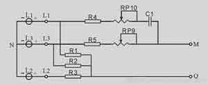 在保護(hù)器電源輸入端⑤、⑥、⑦串接相應(yīng)的RC移相電路(R4、RP9、C11、RP10、R5、R3)。調(diào)整相應(yīng)電位器RP9、RP10,使加至整流橋輸入端M、Q的電壓為確定值(在保護(hù)器工作電源處于額定電壓下進(jìn)行調(diào)整)。如工作電壓有波動(dòng),則由相應(yīng)RC移相電路使整流橋電壓輸入端電壓發(fā)生變化,從而使IC3A②端電壓Vcc也發(fā)生變化。在取樣電路中加入V1穩(wěn)壓管,則保證電壓檢測值不得超過V1穩(wěn)壓值。如超出,則IC3A中V③<V②,輸出①端為“0”,并使IC3B⑤端電平為“0”(C6經(jīng)R28放電,電平下降);同時(shí),IC3B輸入端V⑤<V⑥(V⑥電平由R24、R23分壓取得),輸出端⑦亦為“0”,使IC2⑥端電平為“0”,產(chǎn)品處于保護(hù)狀態(tài)。