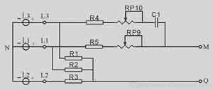 在保護(hù)器電壓處于正常工作帶時(shí),且工作電源端所加電壓相序(L1、L2、L3)為正相序,工作保護(hù)觸點(diǎn)吸合。如L1電壓呈斷相狀態(tài)時(shí),則其余兩相呈過壓狀態(tài),保護(hù)器也隨之進(jìn)入保護(hù)狀態(tài)。當(dāng)L1相又重新恢復(fù)供電,且加入電壓的L1、L2、L3都在其規(guī)定的正常工作帶范圍內(nèi)時(shí),保護(hù)觸點(diǎn)6又重新開始吸合工作。當(dāng)加入工作電源輸入端由L1、L2、L3變?yōu)長2、L1、L3或L3、L2、L1時(shí),因相序發(fā)生變化,保護(hù)器的保護(hù)觸點(diǎn)都呈釋放斷開狀態(tài),無保護(hù)功能。