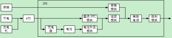 從單個UPS的設(shè)計來說,可以把整個產(chǎn)品按照模塊進行劃分,下面圖中是一個典型的UPS系統(tǒng)結(jié)構(gòu)圖