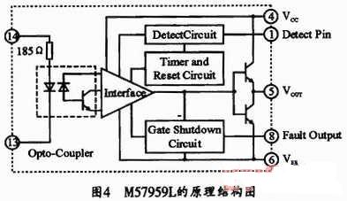 M57959L是日本三菱公司生產(chǎn)的混合集成IGBT驅(qū)動(dòng)器,其內(nèi)部原理結(jié)構(gòu)如圖4所示。它由高速光電隔離輸入,絕緣強(qiáng)度高,可與TTL電平兼容。內(nèi)藏定時(shí)邏輯短路保護(hù)電路,并具有保護(hù)延時(shí)特性。芯片由正負(fù)電源供電,克服了單電源供電時(shí)負(fù)電壓不穩(wěn)的缺點(diǎn),驅(qū)動(dòng)功率大,可驅(qū)動(dòng)200A/600V或100A/1200V的IGBT模塊。由M57959L構(gòu)成的驅(qū)動(dòng)電路如圖5所示。