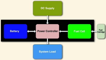 上述系統(tǒng)在使用的不同階段,能夠用做三種能源和兩種負載。當該系統(tǒng)沒有插接直流電源時,燃料電池和/或蓄電池的組合結構能夠為系統(tǒng)負載供電。另外,當直流電源不存在時,燃料電池還能夠對蓄電池進行充電,以盡可能地增強電源斷電末期(end-of-power-shutdown)的性能,或者實現更好的系統(tǒng)動態(tài)電源響應特性。當直流電源可用時,它既對蓄電池進行充電也對系統(tǒng)負載進行供電。