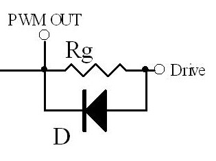 以上討論的是MOSFET ON狀態(tài)時電阻的選擇,在MOSFET OFF狀態(tài)時為了保證柵極電荷快速瀉放,此時阻值要盡量小.通常為了保證快速瀉放,在Rg上可以并聯(lián)一個二極管.當(dāng)瀉放電阻過小,由于走線電感的原因也會引起諧振(因此有些應(yīng)用中也會在這個二極管上串一個小電阻),但是由于二極管的反向電流不導(dǎo)通,此時Rg又參與反向諧振回路,因此可以抑制反向諧振的尖峰.這個二極管通常使用高頻小信號管1N4148.