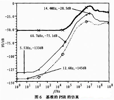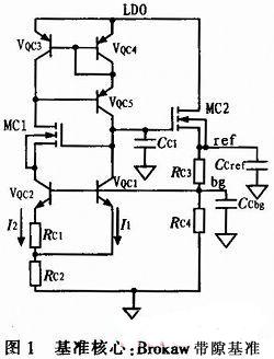 電子鎮(zhèn)流器的供電方式為半橋輸出接穩(wěn)壓管給芯片供電,其輸出電壓為高壓正弦波(50~100 kHz),加之芯片內(nèi)數(shù)字部分的干擾,這就給芯片的電源帶來較大的干擾。因此對(duì)芯片內(nèi)基準(zhǔn)的中頻PSR(Power Supply Rejection,電源抑制)有較大要求。本文從此角度在Brokaw帶隙基準(zhǔn)的基礎(chǔ)上進(jìn)行改進(jìn),采用LDO與基準(zhǔn)的級(jí)聯(lián)設(shè)計(jì)來增加其PSR。