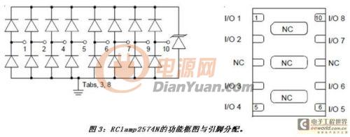 升特公司的最新以太網(wǎng)保護方案RClamp2574N可滿足并超過所有上述要求。建議將其放置于變壓器的PHY端,盡可能靠近磁體。RClamp2574N可配置為保護一個千兆以太網(wǎng)的全部四對差分線對。如圖3所示,八個I/O引腳中的每一個都有一個低電容的控向二極管對,該器件用來將有害的浪涌電流引入內(nèi)部的低壓TVS二極管??叵蚨O管的工作電壓僅有2.5V,采用升特公司專利的EPD工藝技術(shù)制造。低壓導(dǎo)通是一個很重要的保護參數(shù),因為很多PHY芯片都集成了ESD保護結(jié)構(gòu)。這些結(jié)構(gòu)并非針對承受很大的電能而設(shè)計。如果它們在外部保護實
