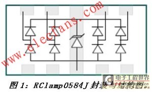 RClamp0584J是這種集成式TVS保護器件的一個最佳實例(圖1)。該器件是RailClamp系列高速接口保護產(chǎn)品的最新成員。這種四線、5V工作電壓保護器件的性能超出了IEC 6100-4-2 level 4對靜電瞬變的保護要求。圖1同時也明確顯示,這款器件采用了獨特的封裝設(shè)計。“穿通型(Flow through)”封裝一詞來自升特公司,這種封裝允許走線直接穿過保護器件,因此最大限度地減小了由于平衡差分線對的中斷或失配所導(dǎo)致的額外寄生電感與電容。