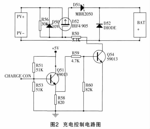 單片機(P2.0)給出充電的控制信號,即P2.0=1,NPN 型S9013 的三極管導通,由于此三極管工作于射極輸出狀態(tài), 其發(fā)射極為高電平,Q54 (2SD667)NPN 三極管導通, 由于穩(wěn)壓管D50的作用, 使得IRF4905管的柵源電壓鉗位在-10V,IRF4905 管導通, 太陽電池向蓄電池充電。反之,前兩極三極管均截止VGS=0V,IRF4905 管斷開,太陽電池不能向蓄電池充電。