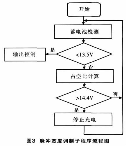 具體方案是,當檢測到蓄電池的電壓小于13.5V時,開關管始終接通,即采取全通充電方式,如果檢測到蓄電池電壓大于13.5V 并小于14.4V 時采取脈寬調(diào)制方式充電,隨著蓄電池電壓的增加,脈寬不斷的變窄,直到蓄電池端電壓上升為14.4V 時,脈寬檢校為0,停止充電。脈寬調(diào)制方式由軟件來實現(xiàn)。