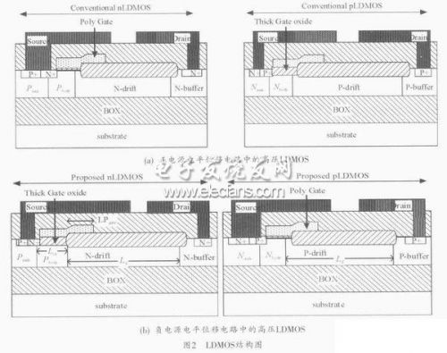 由于負(fù)電源供電的電平位移電路結(jié)構(gòu)的改變,應(yīng)用于正電源的常規(guī)nLDMOS和pLDMOS不能滿足該電路結(jié)構(gòu)要求。在正電源供電的電平位移電路中,由于pLDMOS的源端接高壓電源,其柵源需要承受高壓,所以pLDMOS采用了厚柵氧的結(jié)構(gòu),如圖2(a)所示。在使用負(fù)電源的電平位移電路結(jié)構(gòu)中(圖1(b)),pLDMOS的源端為邏輯高壓8V,柵端由低壓邏輯0~8V電壓控制,因此柵源不再承受高壓。但是nLDMOS的源端為負(fù)電源的最低電位,其柵源需要承受高壓,因此高壓nLDMOS需要采用厚柵氧結(jié)構(gòu),如圖2(b)所示。