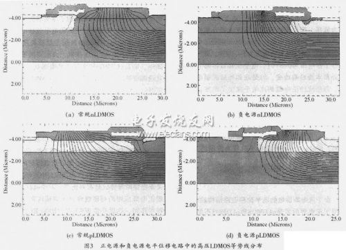 傳統(tǒng)正電源應(yīng)用的電平位移電路結(jié)構(gòu)如圖1(a)所示。L1、L2、L3是由邏輯電路部分產(chǎn)生的低壓時(shí)序控制信號(hào),N1、N2、N3為高壓nLDMOS器件,P1、P2、P3為高壓平pLDMOS器件。由P1,P2和N1、N2構(gòu)成的電平位移單元將L1、L2的低壓邏輯信號(hào)轉(zhuǎn)變?yōu)榭梢钥刂芇3管的高壓電平,與L3一起控制由P3和N3組成的反向輸出級(jí),從而實(shí)現(xiàn)從低壓邏輯信號(hào)到高壓驅(qū)動(dòng)輸出的轉(zhuǎn)換。