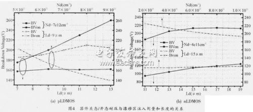 利用工藝器件聯(lián)合仿真,在傳統(tǒng)的正電源應(yīng)用的LDMOS基礎(chǔ)上對(duì)器件的結(jié)構(gòu)參數(shù)進(jìn)行優(yōu)化設(shè)計(jì)。圖4(a)為pLDMOS在漂移區(qū)注入劑量Nd=7 e12cm-2時(shí)關(guān)態(tài)耐壓、開態(tài)耐壓與漂移區(qū)長(zhǎng)度Ld(μm)的關(guān)系,以及在漂移區(qū)長(zhǎng)度Ld=9μm情況下關(guān)態(tài)耐壓、開態(tài)耐壓與漂移區(qū)注入劑量Nd(cm-2)的關(guān)系。其他參數(shù)為:n型體區(qū)注入劑量5e12 cm-2,Nsink注入劑量3e15 cm-2,P-buffer注入劑量1.5e13 cm-2,溝道長(zhǎng)度3μm,柵極場(chǎng)板3μm。從仿真結(jié)果可以看出:pLDMOS的關(guān)態(tài)耐壓隨漂移區(qū)的增加而增大,隨漂移區(qū)的注入劑量的增大先增大后減小;開態(tài)耐壓隨著漂移區(qū)注入劑量的增大而降低,但是在一定范圍內(nèi)漂移區(qū)長(zhǎng)度對(duì)其影響較小。總體上,pLDMOS的關(guān)態(tài)耐壓、開態(tài)耐壓都在160V以上,完全能夠滿足8~-100V工作電壓(108V耐壓)的要求。