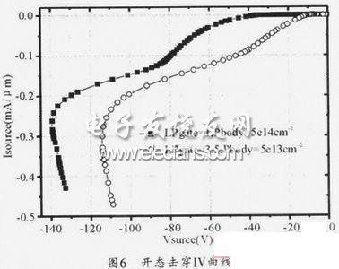 針對(duì)nLDMOS器件開態(tài)耐壓低的問題,有針對(duì)性地仿真了溝道長(zhǎng)度、多晶硅柵場(chǎng)板長(zhǎng)度及體區(qū)濃度對(duì)開態(tài)耐壓的影響。圖5(a)為nLDMOS的關(guān)態(tài)耐壓、開態(tài)耐壓及閾值與溝道長(zhǎng)度(Lch)的關(guān)系。可以看出溝道長(zhǎng)度對(duì)器件的開態(tài)耐壓和關(guān)態(tài)耐壓影響很小。閾值隨著溝道長(zhǎng)度的增加而增加,這是由于采用橫向雙擴(kuò)散形成溝道,所以隨著溝道長(zhǎng)度增加,p型體區(qū)的濃度越來(lái)越大,閾值也就越來(lái)越大。圖5(b)為nLDMOS的關(guān)態(tài)耐壓、開態(tài)耐壓及閾值與多晶硅柵極場(chǎng)板長(zhǎng)度(LPgate)的關(guān)系。在柵極場(chǎng)板較長(zhǎng)時(shí),其對(duì)閾值和關(guān)態(tài)耐壓影響很小,當(dāng)柵極場(chǎng)板縮短到多晶硅柵不能覆蓋溝道時(shí),器件的開態(tài)耐壓大幅增加。這時(shí)閾值也迅速增加。雖然多晶硅柵不能完全覆蓋溝道,但是由于開態(tài)時(shí)nLDMOS的柵漏電壓差很大,所以仍然能夠在表面形成反型層溝道。因此,大幅減短?hào)艠O場(chǎng)板能有效提高器件的開態(tài)耐壓,但是同時(shí)也帶來(lái)了器件不能有效開啟的問題。圖5(c)為nLDMOS的關(guān)態(tài)耐壓、開態(tài)耐壓及閾值與體區(qū)注入劑量(Pbody)的關(guān)系??梢钥闯鲈黾芋w區(qū)的注入劑量對(duì)器件的耐壓影響很小。但是隨著注入劑量的增加,體區(qū)濃度增加,所以閾值就增加,同時(shí)器件的開態(tài)耐壓也隨之增加。當(dāng)體區(qū)注入劑量達(dá)到5e14cm-2時(shí),閾值增加緩慢,開態(tài)耐壓卻大幅增加,所以只能通過閾值上的犧牲來(lái)改善nLDMOS的開態(tài)擊穿耐壓。