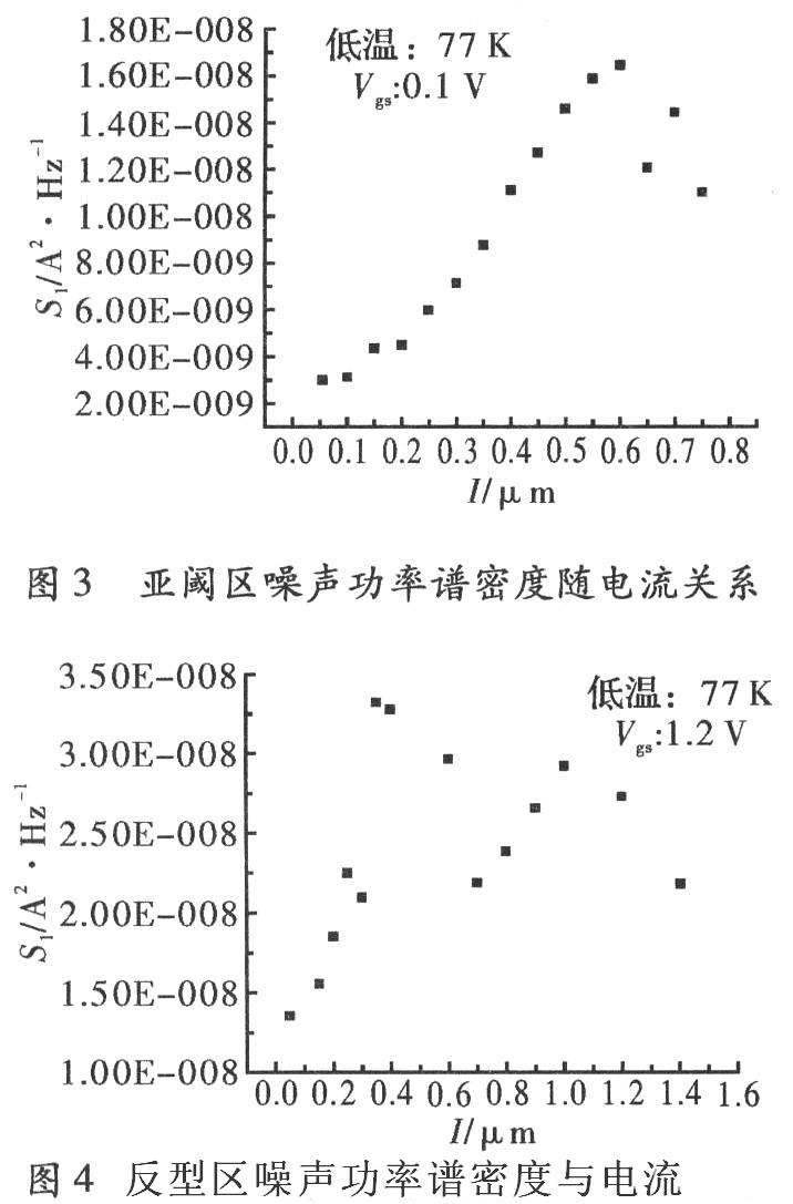 圖3和圖4分別為器件工作在亞閾區(qū)和反型區(qū)條件下,電流噪聲功率譜隨漏源電流的變化情況。
