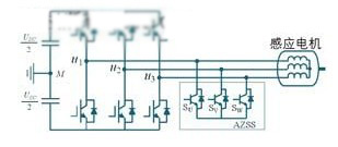 m.d.manjrekar和a.rao等學(xué)者提出了一種通過添加輔助零狀態(tài)開關(guān),以消除因零開關(guān)狀態(tài)而產(chǎn)生共模電壓的方案,電路結(jié)構(gòu)見圖4所示。這種輔助零狀態(tài)合成器方法在經(jīng)濟(jì)方面很有吸引力,并且還可以使消除感應(yīng)電機(jī)側(cè)共模電壓。