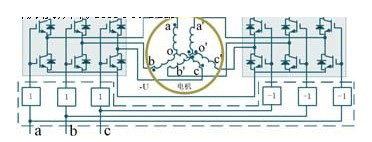 為了消除pwm電機(jī)驅(qū)動系統(tǒng)共模電流,a.consoli等學(xué)者基于共模電壓補(bǔ)償技術(shù),提出了一種應(yīng)用于由兩個或多個功率變換器組成的多驅(qū)動系統(tǒng)公共直流母線共模電流消除技術(shù),拓?fù)浣Y(jié)構(gòu)見圖6所示。該方法是在兩個功率變換器做適當(dāng)連接的基礎(chǔ)上,通過控制兩個變換器狀態(tài)序列而使共模電壓同步變化的新pwm調(diào)制策略。