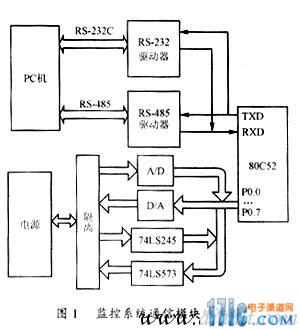 為了組建開關(guān)電源監(jiān)控系統(tǒng),系統(tǒng)中的每臺(tái)電源配置了一個(gè)獨(dú)立的監(jiān)控系統(tǒng)通信模塊。監(jiān)控系統(tǒng)通信模塊采用的控制芯片是MCS51系列單片機(jī)80C52。80C52具有8k的內(nèi)部ROM和256字節(jié)的內(nèi)部RAM。監(jiān)控系統(tǒng)通信模塊電路結(jié)構(gòu)圖如圖1所示。計(jì)算機(jī)通過該通信模塊可以實(shí)時(shí)讀取電源的輸出電壓、輸出電流值以及輸出過壓、輸入過壓、輸入欠壓、過流、過熱、運(yùn)行/停止等8路開關(guān)量的狀態(tài)值,并可以在輸出值允許的范圍內(nèi)任意設(shè)置電源的輸出電壓、輸出電流值和復(fù)位、合閘、分閘、機(jī)控/本控4路開關(guān)量的狀態(tài)值。從監(jiān)控系統(tǒng)通信模塊電路結(jié)構(gòu)示意圖可以看出,如果計(jì)算機(jī)需要讀取電源模塊的輸出電壓、輸出電流值和開關(guān)量的狀態(tài)時(shí),單片機(jī)收到請(qǐng)求命令后啟動(dòng)A/D轉(zhuǎn)換芯片MAX182對(duì)電源的輸出電壓、輸出電流兩路模擬量進(jìn)行轉(zhuǎn)換,轉(zhuǎn)換后的數(shù)據(jù)送入單片機(jī)進(jìn)行數(shù)據(jù)處理。同時(shí)表征電源運(yùn)行狀態(tài)的8路開關(guān)量從雙總線收發(fā)器74LS245讀入送至單片機(jī)寄存器存貯。單片機(jī)將所有處理后的數(shù)據(jù)按預(yù)定數(shù)據(jù)傳送格式發(fā)送給計(jì)算機(jī)輸出顯示。計(jì)算機(jī)需要設(shè)置電源的輸出電壓、輸出電流值和4路開關(guān)量的狀態(tài)時(shí),計(jì)算機(jī)將設(shè)置好的數(shù)據(jù)按預(yù)定格式發(fā)送給單片機(jī)。單片機(jī)接收處理后啟動(dòng)D/A轉(zhuǎn)換芯片MAX532和輸出鎖存器74LS573將處理后的輸出電壓、輸出電流值和開關(guān)量狀態(tài)值輸出給電源。監(jiān)控系統(tǒng)通信模塊從而實(shí)現(xiàn)了計(jì)算機(jī)對(duì)電源的實(shí)時(shí)監(jiān)控。為了保證設(shè)計(jì)人員的安全和防止通信模塊受電源影響而損壞,電源與通信模塊之間的信號(hào)傳遞均通過光耦隔離。