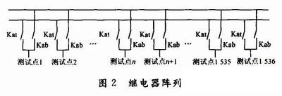 繼電器陣列由3168個(gè)繼電器實(shí)現(xiàn)了1536個(gè)測(cè)試點(diǎn)之間的導(dǎo)通/絕緣測(cè)試和繼電器組之間的隔離。1 536個(gè)測(cè)試點(diǎn)分布在12塊單板上面,每塊單板上面有128個(gè)測(cè)試點(diǎn),單板內(nèi)又分為16行,每行8列,即12×16×8=1 536。每一個(gè)測(cè)試點(diǎn)由兩個(gè)繼電器控制,分別是輸入繼電器(Kat)和輸出繼電器(Kab)。每塊單板對(duì)應(yīng)外部的一個(gè)128芯的航空插頭,負(fù)責(zé)和被測(cè)產(chǎn)品的連接。其原理如圖2所示。