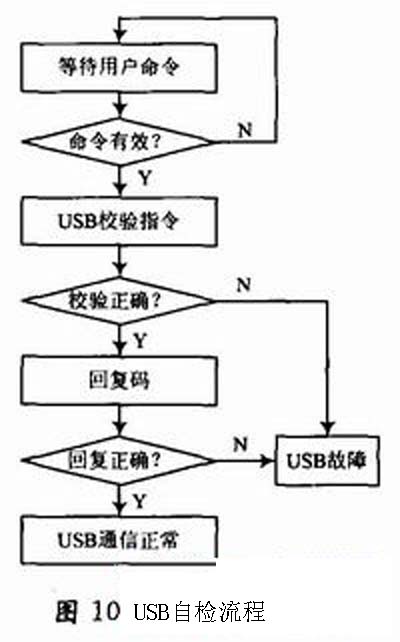 為了保證設(shè)備本身的工作正常,電纜測(cè)試系統(tǒng)提供自檢功能。自檢流程分為兩部分,第一部分對(duì)USB通道進(jìn)行自檢,USB自檢流程如圖10所示。系統(tǒng)上電后,工控機(jī)發(fā)送校驗(yàn)指令,單片機(jī)判斷校驗(yàn)碼是否正確,在校驗(yàn)碼正確的情況下,按照協(xié)議返回復(fù)碼,工控機(jī)判斷回復(fù)碼正確的情況下,USB通信建立正常。第二部分是對(duì)繼電器陣列進(jìn)行自檢,其流程與導(dǎo)通測(cè)試類(lèi)似。以測(cè)試點(diǎn)1和測(cè)試點(diǎn)2為例,首先,閉合測(cè)試點(diǎn)1的輸入繼電器,采樣測(cè)試電壓,如果系統(tǒng)判斷為斷開(kāi),則可以說(shuō)明測(cè)試點(diǎn)1的輸出繼電器沒(méi)有常閉,反之則說(shuō)明為常閉故障。把測(cè)試點(diǎn)1的輸入繼電器更換為輸出繼電器,采用同樣的方法可以判斷出測(cè)試點(diǎn)1的輸入繼電器是否為常閉故障。其次,分別打開(kāi)測(cè)試點(diǎn)1的輸入和輸出繼電器,如果系統(tǒng)判斷為導(dǎo)通,在第一步的基礎(chǔ)上就可以說(shuō)明兩個(gè)繼電器均正常;如果系統(tǒng)判斷為斷開(kāi),則兩個(gè)繼電器中至少有一個(gè)為常開(kāi)故障。最后,在外部端口上接入自檢插頭,分別選擇測(cè)試點(diǎn)1的輸入繼電器和測(cè)試點(diǎn)2的輸出繼電器,如果系統(tǒng)判斷為導(dǎo)通,則可以說(shuō)明內(nèi)部繼電器和單板到端口的引線正常,反之則說(shuō)明繼電器到測(cè)試端的引線出現(xiàn)問(wèn)題。