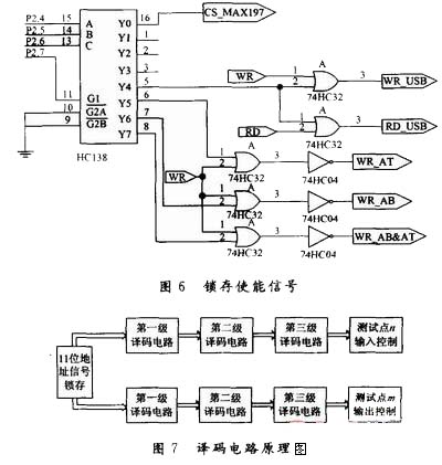 繼電器譯碼電路的作用是在單片機(jī)的控制下將1 536個(gè)測(cè)試點(diǎn)中的某兩個(gè)測(cè)試點(diǎn)接入相應(yīng)的測(cè)試電路。比如譯碼電路選中測(cè)試點(diǎn)1的輸入繼電器Kat和測(cè)試點(diǎn)2的輸出繼電器Kab,外部的被測(cè)電纜通過(guò)這兩個(gè)測(cè)試點(diǎn)接入相應(yīng)的測(cè)試電路,從而實(shí)現(xiàn)了導(dǎo)通或者絕緣測(cè)試。為了實(shí)現(xiàn)這樣的功能譯碼電路可以分為地址鎖存電路,輸入繼電器譯碼電路和輸出繼電器譯碼電路。以輸入地址鎖存電路為例,其原理如圖5,圖6所示。