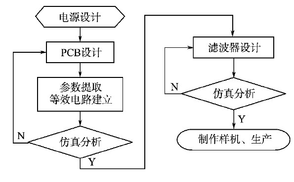 如果以上所有降低EMI的措施都完成了還沒有達到EMC的標準,就可以根據(jù)前面仿真分析得到的差模和共模干擾的波形對濾波器進行設計。在設計濾波器的時候,也同樣要注意元件的布局,還有PCB寄生參數(shù)對濾波器阻抗的影響,其本質也是增大對干擾的阻抗,使干擾無法通過傳播路徑。開關電源設計流程如圖5所示。