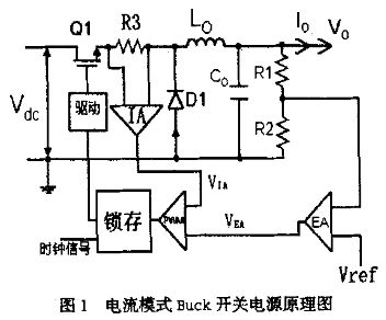開關(guān)電源可以有很多種結(jié)構(gòu),但原理基本相似。圖1是電流模式降壓斬波fg(Buck)開關(guān)電源的原理圖。它和電壓模式的主要區(qū)別是增加了電流采樣電阻R3和電流放大器IA. R3的阻值一般很小,以避免大的功耗。功率管Ql在每個周期開始的時候開啟并維持一段時間Ton,通過濾波電感Lo對濾波電容C。充電、同時向負(fù)載提供電流,此時Lo上電流隨時間的變化率為