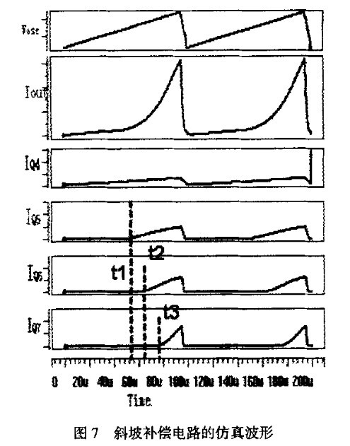 圖7是在選取了元件尺寸后計算機(jī)仿真波形。其中Vosc是理想化的鋸齒波,Iout是輸出的補(bǔ)償電流,IQ4、IQ5、IQ6、 IQ7分別是Q4, Q5, Q6和Q7的漏極電流,可以看到,為了在占空比小于50%的時候系統(tǒng)更加穩(wěn)定,Q4在每個周期開始時就已經(jīng)開啟,但是電流的斜率較小。隨著Vosc以恒定的斜率上升,將先后在t1, t2, t3時達(dá)到Q5, Q6和07的開啟點。設(shè)Q4, Q5, Q6, Q7開啟后的電流斜率分別為m4, m5, m6和m7,