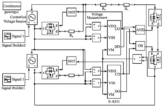 根據(jù)上述均衡充電保護板電路工作的基本原理,在Matlab/Simulink環(huán)境下搭建了系統(tǒng)仿真模型,模擬鋰電池組充放電過程中保護板工作的情況,驗證該設計方案的可行性。為簡單起見,給出了鋰電池組僅由2節(jié)鋰電池串聯(lián)的仿真模型,如圖5所示。