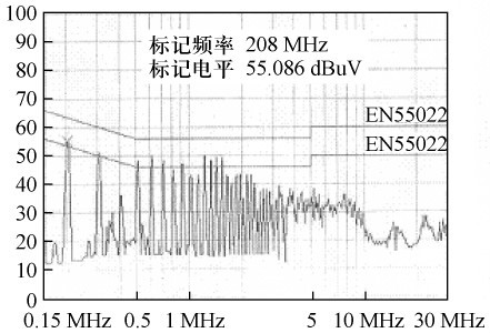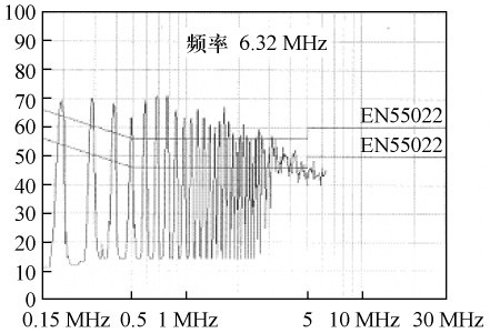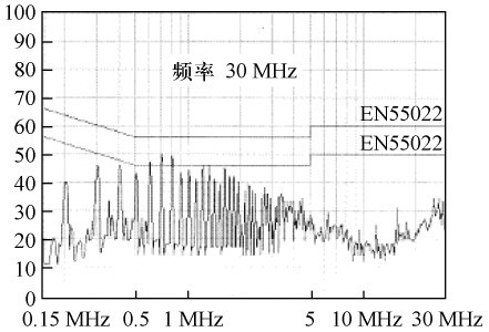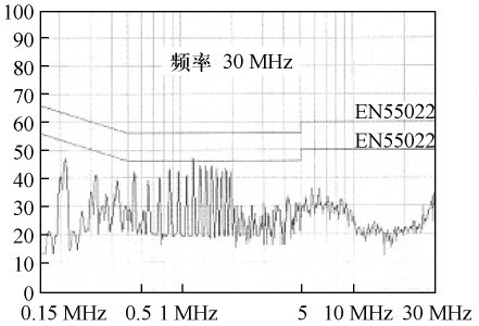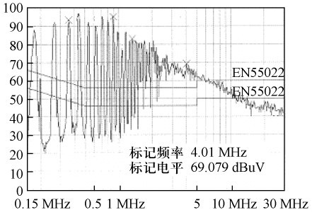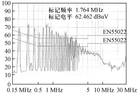 根據(jù)圖3 所示的結(jié)構(gòu)。繞制變壓器,并在交流整流濾波后增設(shè)13 mH 差模濾波電感和6. 8差模濾波電容,對開關(guān)電源進(jìn)行傳導(dǎo)EMI 測試,結(jié)果如圖6 所示。由圖6 可見,傳導(dǎo)EMI 非常嚴(yán)重,不能通過電磁干擾測試。在交流整流前增設(shè)35 mH 共模濾波電感,傳導(dǎo)EMI 測試結(jié)果如圖7 所示,產(chǎn)品即可通過測試。比較測試結(jié)果可得出:在圖3 所示的電路中,主要是由于大量共模傳導(dǎo)EMI,才使電源不能通過電磁干擾測試。