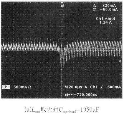 輸出電壓的穩(wěn)定過(guò)程中,一方面由輸出濾波電感的儲(chǔ)能來(lái)逐步補(bǔ)充,另一方面由反饋環(huán)控制電路原邊快速輸出更大功率。輸出電感的取值一般由電流紋波系數(shù)λ和電源的空載特性來(lái)確定,為了避免容性跳變輸出電壓過(guò)大的下沖,使控制電路達(dá)到極限,電感的取值要大于λ的理論值計(jì)算所得數(shù)值,但同時(shí)也要考慮輸出失載時(shí)的電壓上沖幅度,所以輸出電感也不能太大,大的電感一般不易制作、成本較高,所以電感的實(shí)際取值可以用實(shí)驗(yàn)的方法得到。圖4給出了輸出電感Lout不同取值時(shí),容性負(fù)載突變時(shí)輸出電感電流的跳變波形和最大的容性負(fù)載能力。